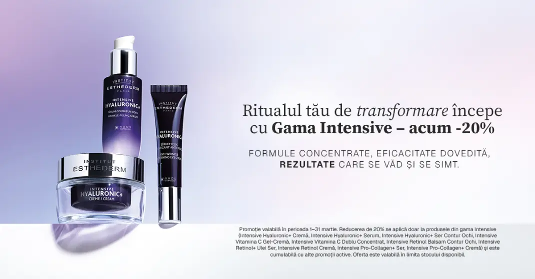 Promoție valabilă în perioada 1–31 martie. Reducerea de 20% se aplică doar la produsele din gama Intensive (Intensive Hyaluronic+ Cremă, Intensive Hyaluronic+ Serum, Intensive Hyaluronic+ Ser Contur Ochi, Intensive Vitamina C Gel-Cremă, Intensive Vitamina C Dublu Concentrat, Intensive Retinol Balsam Contur Ochi, Intensive Retinol+ Ulei Ser, Intensive Retinol Cremă, Intensive Pro-Collagen+ Ser, Intensive Pro-Collagen+ Cremă) și este cumulabilă cu alte promoții active. Oferta este valabilă în limita stocului disponibil.