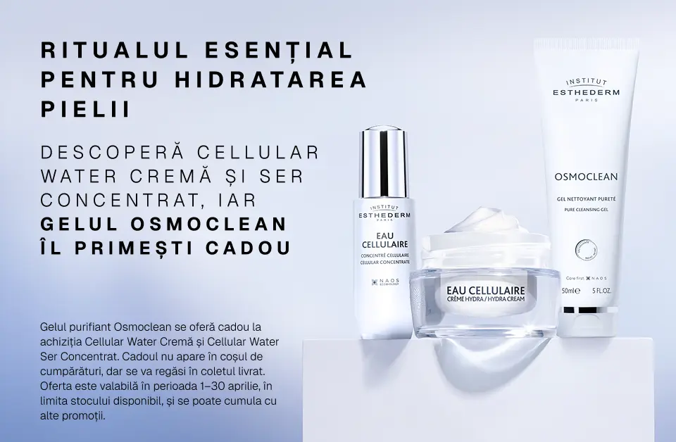 Gelul purifiant Osmoclean se oferă cadou la achiziția Cellular Water Cremă și Cellular Water Ser Concentrat. Cadoul nu apare în coșul de cumpărături, dar se va regăsi în coletul livrat. Oferta este valabilă în perioada 1–30 aprilie, în limita stocului disponibil, și se poate cumula cu alte promoții.
